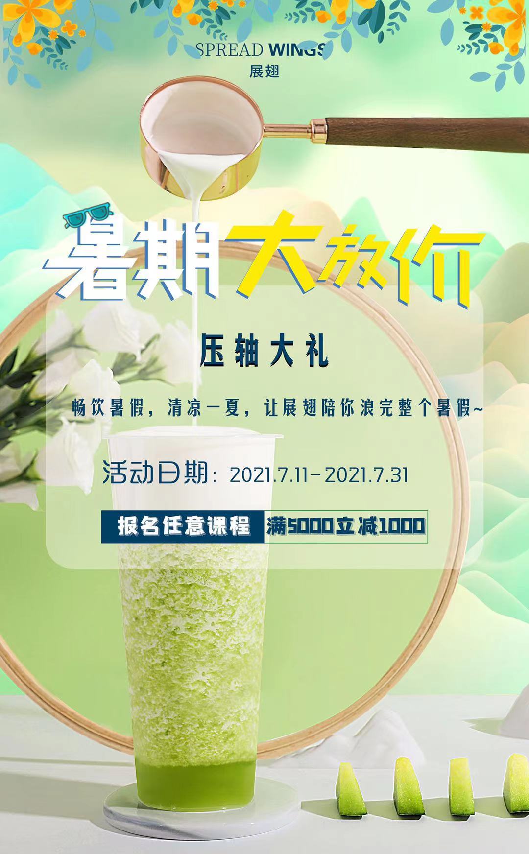 福利來啦!為了回饋各位親愛的顧客,這個暑假來佛山展翅學(xué)習(xí)一門手藝,從烘焙、西點、蛋糕、咖啡、奶茶、調(diào)酒等等應(yīng)有盡有,在這個夏天,許多學(xué)生沒事做只能在家度過兩個月的時間,還不如趁著暑假,對甜點類感興趣的朋友們!過來學(xué)習(xí)一門手藝,對你以后開店創(chuàng)業(yè)都有幫助哦,我們還專門設(shè)立了試吃活動,現(xiàn)在暑假期間從7月11日起至9月1日只要報名任意課程,滿5000元立即減1000元,歡迎過來搶購,你還在等什么?