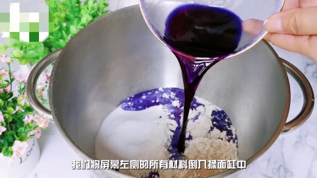 2、依次將高筋面粉、蝶豆花水、細(xì)砂糖、酵母,全部放入廚師機里用“低速”混合均勻