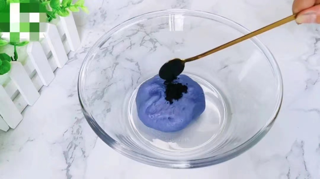 4、取出面團,分為兩個劑子,其中一份面團加入竹炭粉