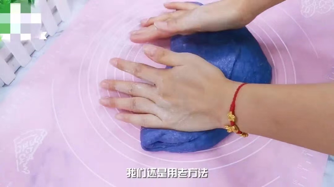 7、把蝶豆花顏色的面團,用搟面杖搟成長方形,并加入堅果果干