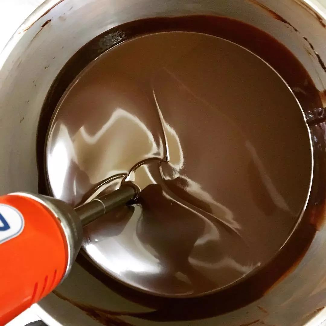 1、將冷藏中的黑色鏡面淋面醬拿出來,用微波爐將其加熱至2/3完全溶解,用均質(zhì)機(jī)打至光滑無氣泡即可。