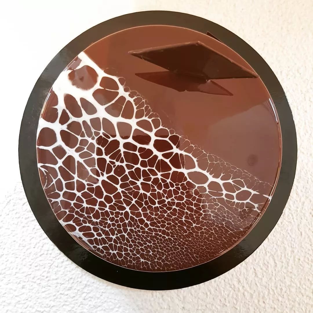 3、黑色鏡面醬倒下去之后等其覆蓋整個(gè)慕斯蛋糕體時(shí),將豹紋淋面醬滴兩滴在黑色淋面醬上,用抹刀迅速抹過去,2—5秒即可出現(xiàn)豹紋的紋路。