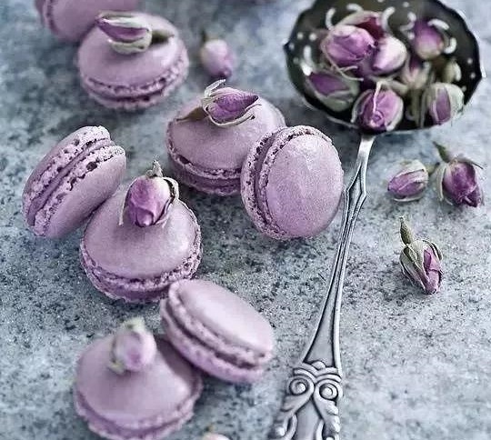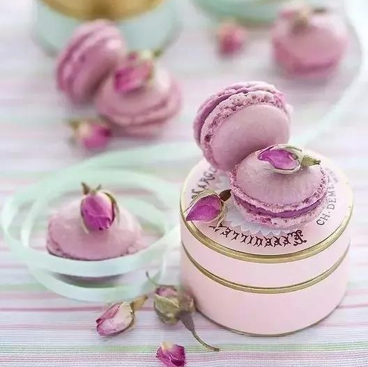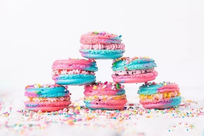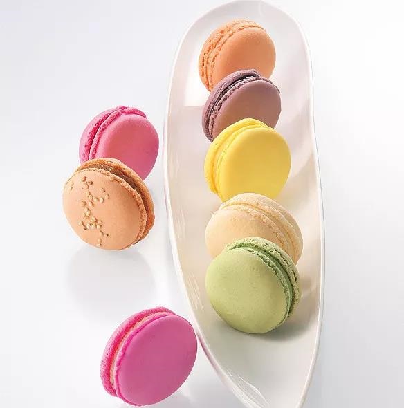 一枚完美的馬卡龍,表面光滑,無坑疤,在燈光照射下泛著淡淡光澤,餅身下緣還會出現(xiàn)一圈漂亮的蕾絲裙邊。由于不同裝飾材料,如抹茶粉、水果粉的加入,使得馬卡龍呈現(xiàn)出繽紛的顏色。