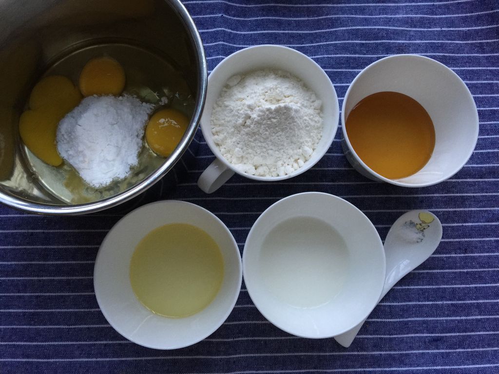 低粉100克、牛奶50克、糖105克、烘焙粉1克、黃油30克、雞蛋5個