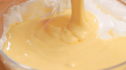 4、蛋白分兩次加入蛋黃糊中,每次都要翻拌均勻,不可過度翻拌,避免消泡